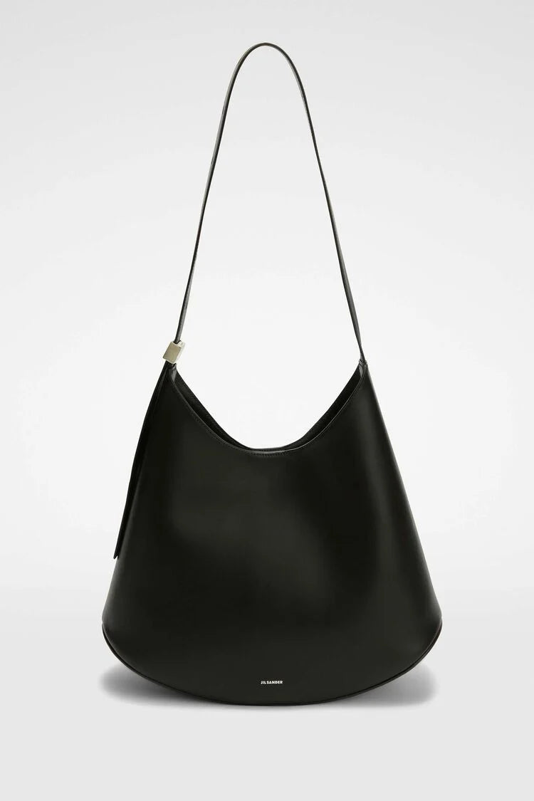 Medium-sized leather shoulder bag with metal jewel buckle, curved base in contrasting leather and embossed Jil Sander logo