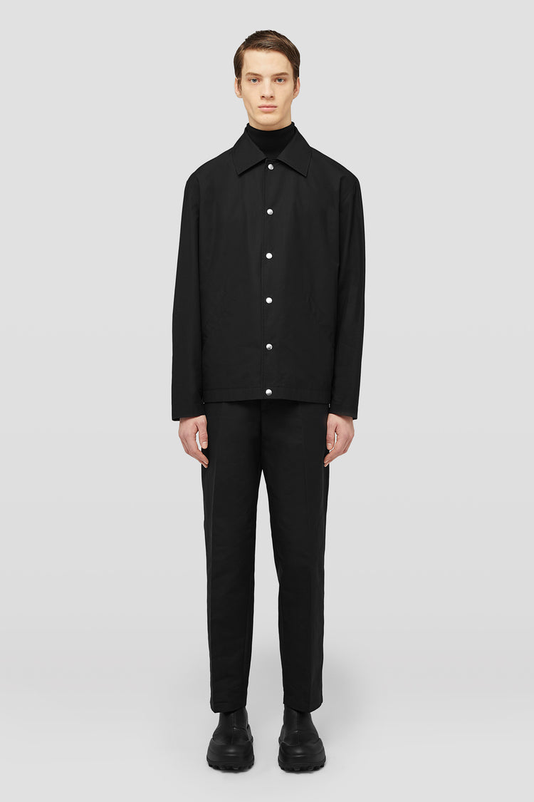 relaxed fit and boxy shape; flat collar and dropped shoulders; snap button closure; jetted pockets; adjustable button closure cuff; printed Jil Sander logo on back; lightweight water repellent cotton poplin;100% cotton; made in Italy