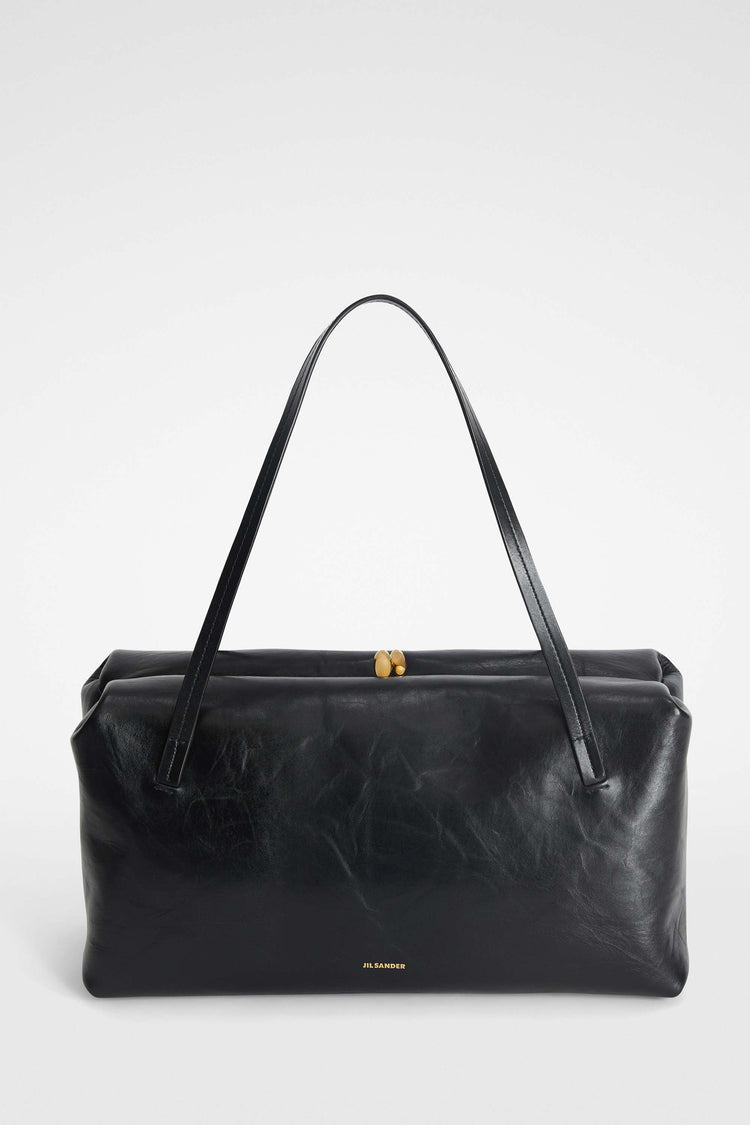 leather top handles; rectangular and soft shape; sleek metal frame with clutch closure; inner card slot; nappa lining; embossed Jil Sander logo; expandable side insert;100% calf leather; made in Italy
