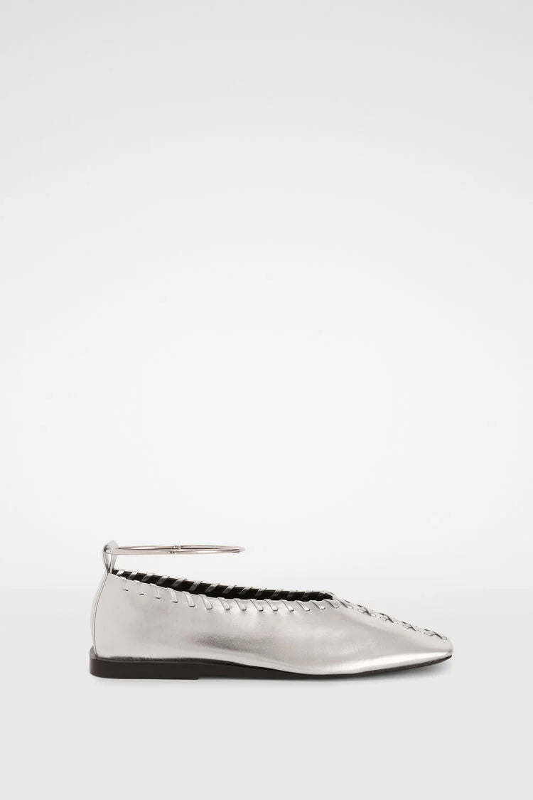 Laminated leather ballerina with stitching details and detachable metal ankle bracelet