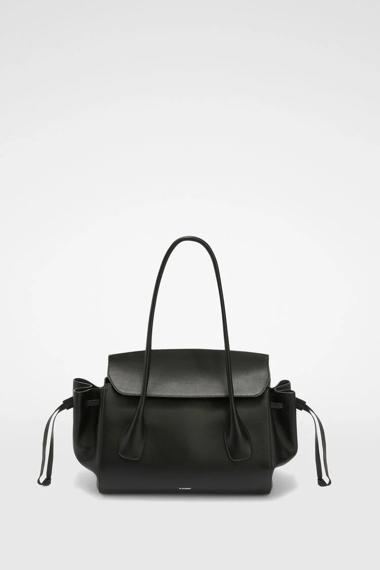 Small-sized leather handbag with adjustable volume side inserts and embossed Jil Sander logo