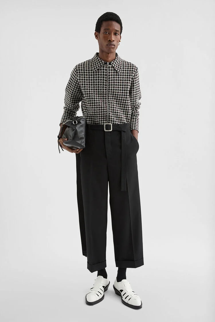 Long-sleeved fine-knit wool and polyester blend shirt with zip closure and check print