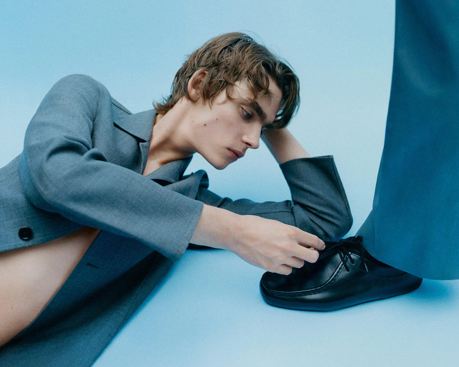 The images are conceived in the same way, using the white, liminal space of the photographic studio as a springboard for tension and calm. In shaping a compelling visual language for the brand, image-making becomes a study of opposites — between protection and exposure, strength and vulnerability.