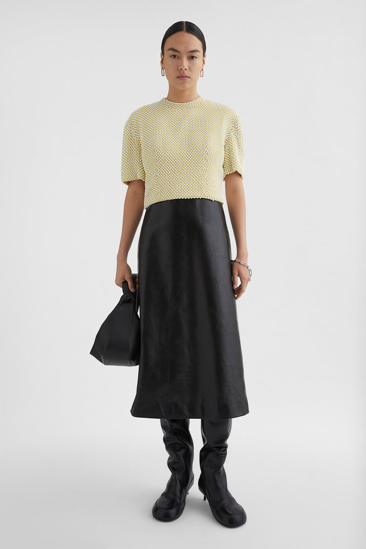 Sleeveless dress with leather skirt and detachable embroidered top