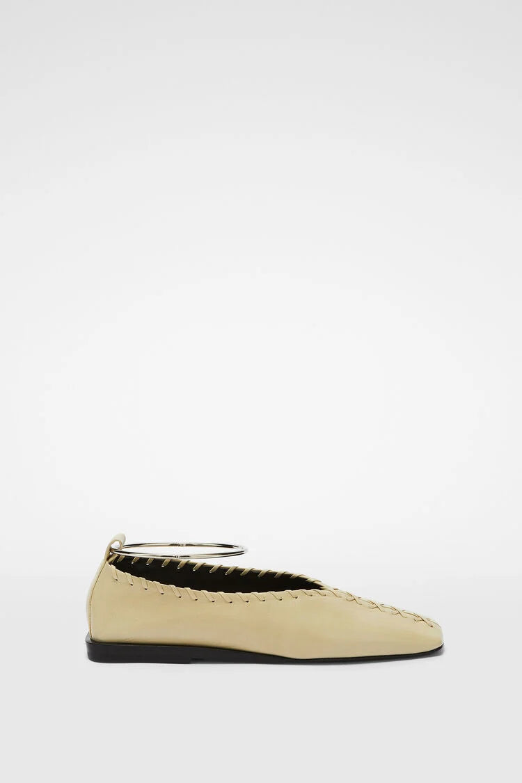 Leather ballerina with stitching details and detachable metal ankle bracelet