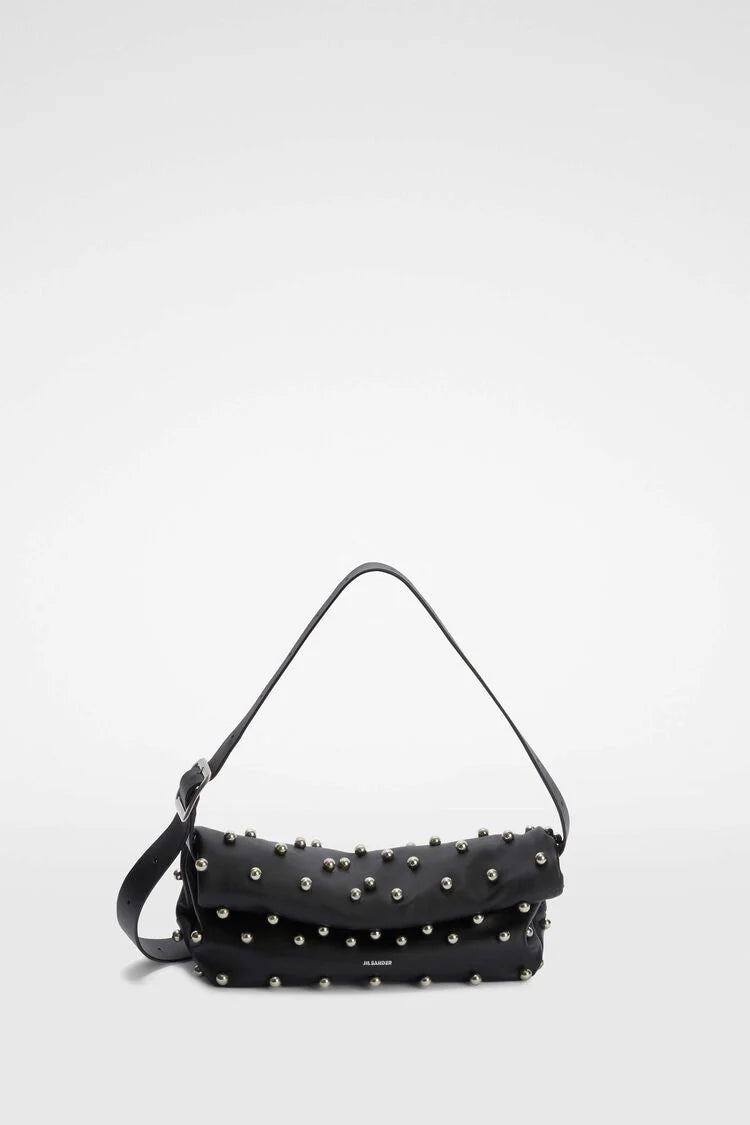Small-sized leather crossbody bag with adjustable strap, all-over applied studs and embossed Jil Sander logo