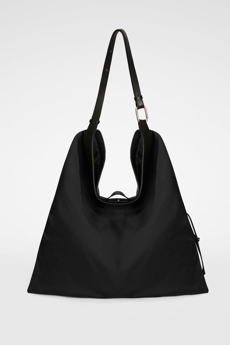 adjustable and detachable leather shoulder strap; outer zipped pocket with leather zip pullers; nappa lining; printed Jil Sander logo; body 100% polyamide-nylon, coating 100% polyurethane; made in Italy